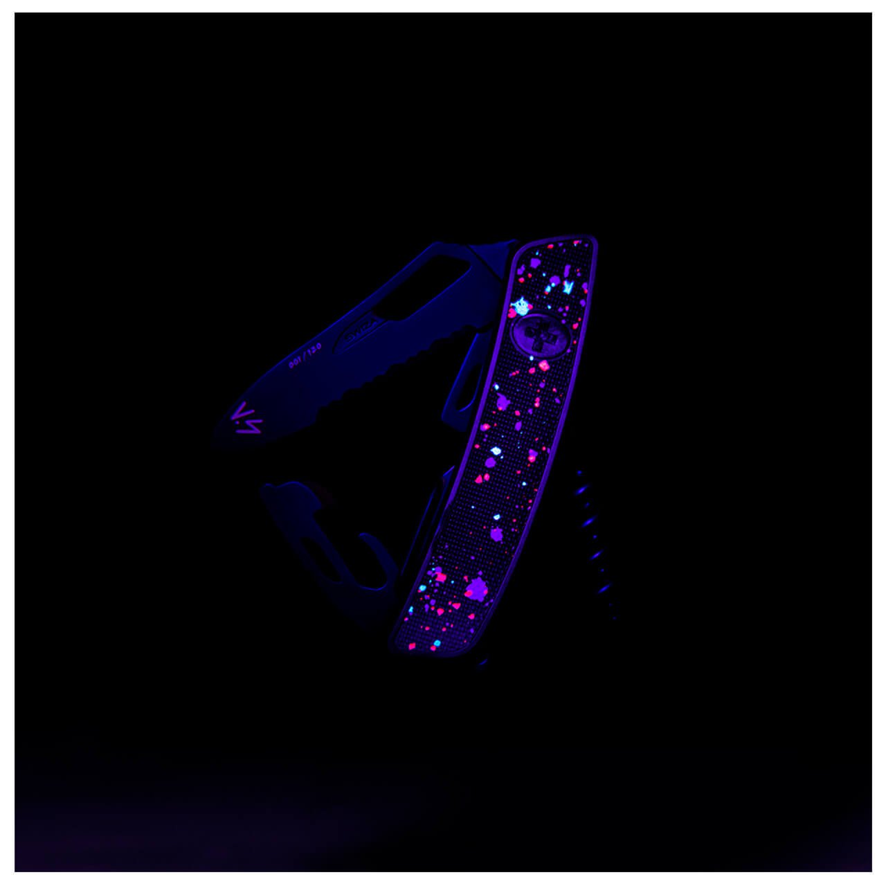Cada cuchillo está pintado a mano y reacciona a la luz ultravioleta, revelando obras de arte ocultas al desvanecerse. En la hoja están grabados la firma del artista y el número de la pieza, hacen que esta navaja sea una auténtica pieza de colección. Una fusión perfecta entre arte contemporáneo y la maestría de la cuchillería suiza.